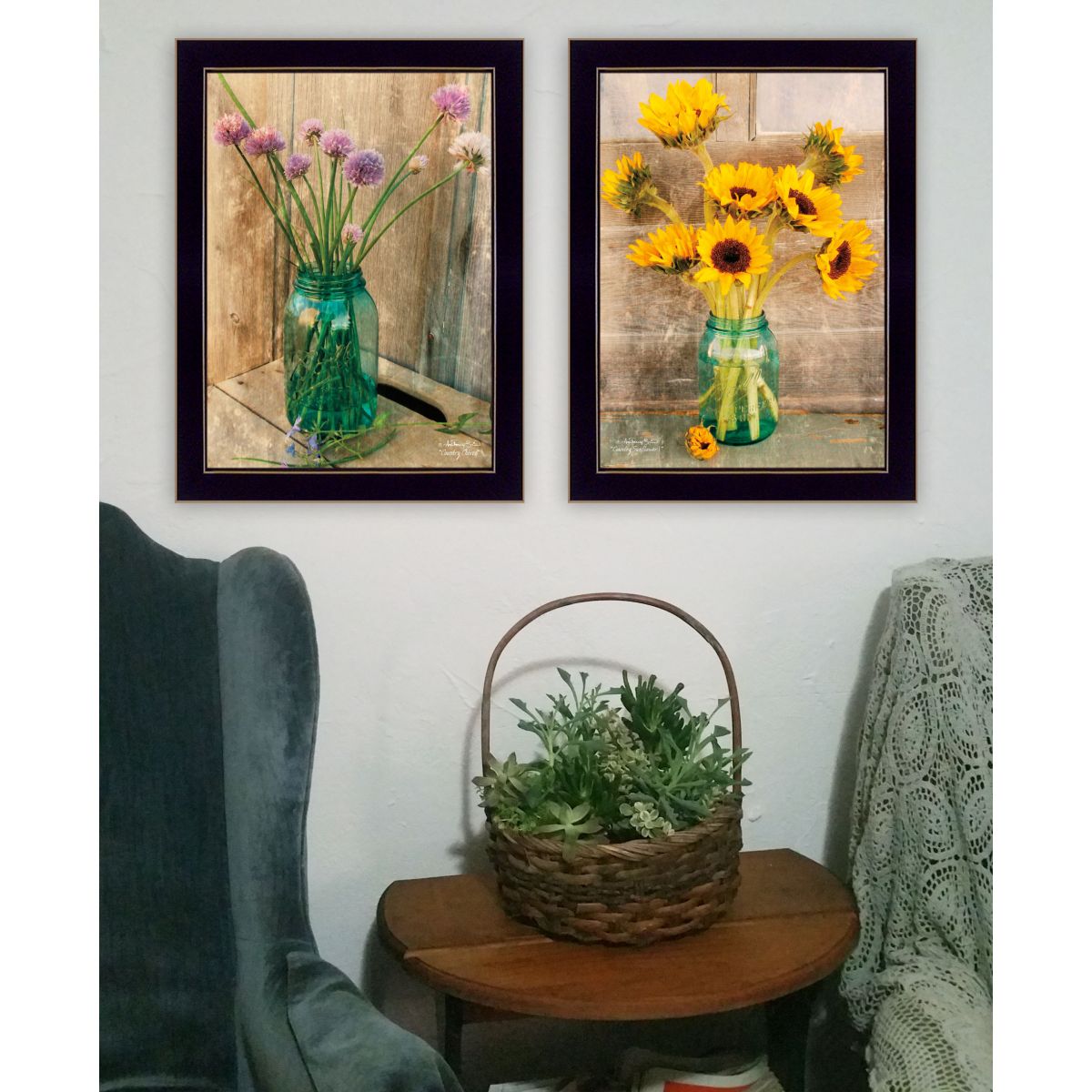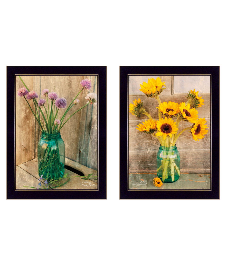 “Country Sunflowers & Chives” 2-Piece Vignette by Anthony Smith, Ready to Hang Framed Print, Black Frame