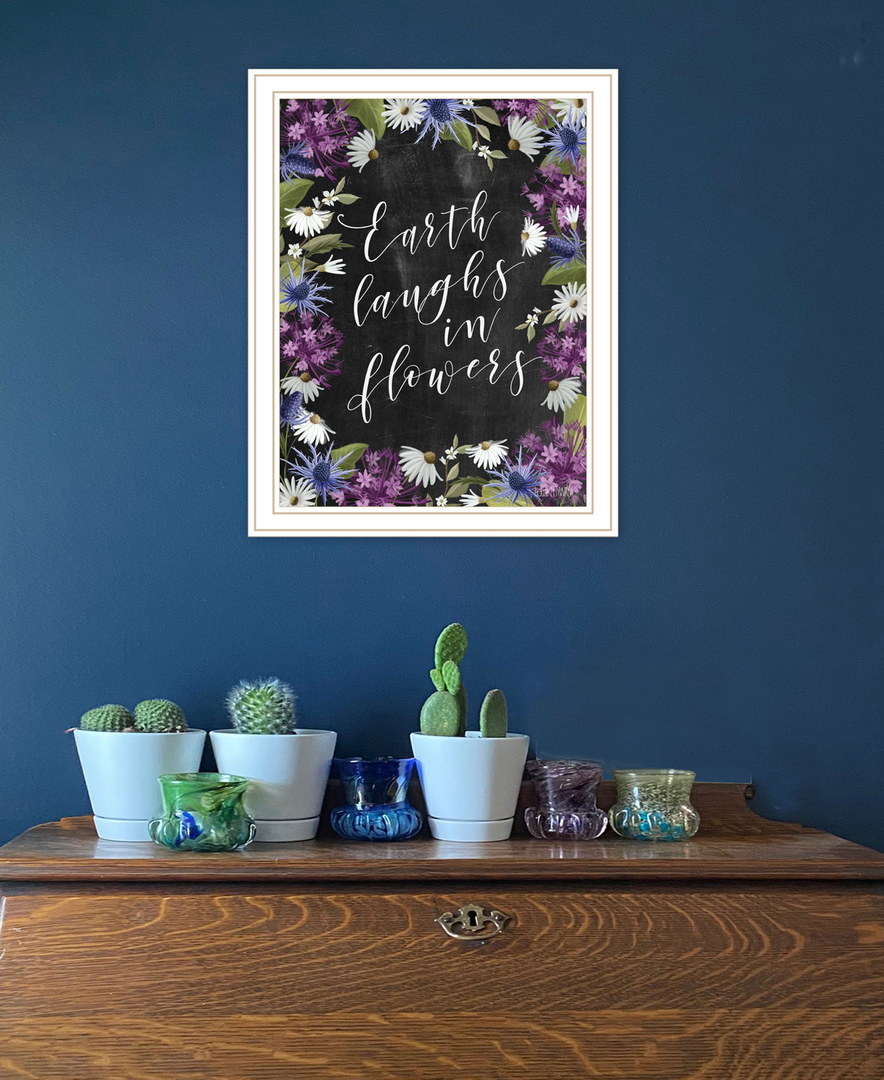 "Earth Laughs in Flowers" is by Artisan House Fenway. This 14"X18" decorative white framed wall art. This image features a flower arrangement of blue, purple, and white framing the script reading "Earth laughs in flowers". Our products are proudly made by skilled American workers. The surface of our framed art is textured with a fade resistant coating, so no glass is necessary. A vegetable-based glue is used in the production of our products, and our frames are crafted from 100% recycled material. In keeping with our environmentally friendly approach towards manufacturing. Arrives ready to hang.