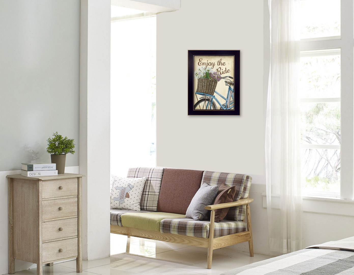 DEW426 "Enjoy the Ride" is a 14"x 18" framed art print in a decorative black frame of the art of Debbie DeWitt. The art shows a vintage bicycle with a basket of flowers and the Script '"Enjoy the Ride" .'The print has a protective, archival finish (glass is not needed) and arrives ready to hang. Made in the USA with pride by skilled American workers.
