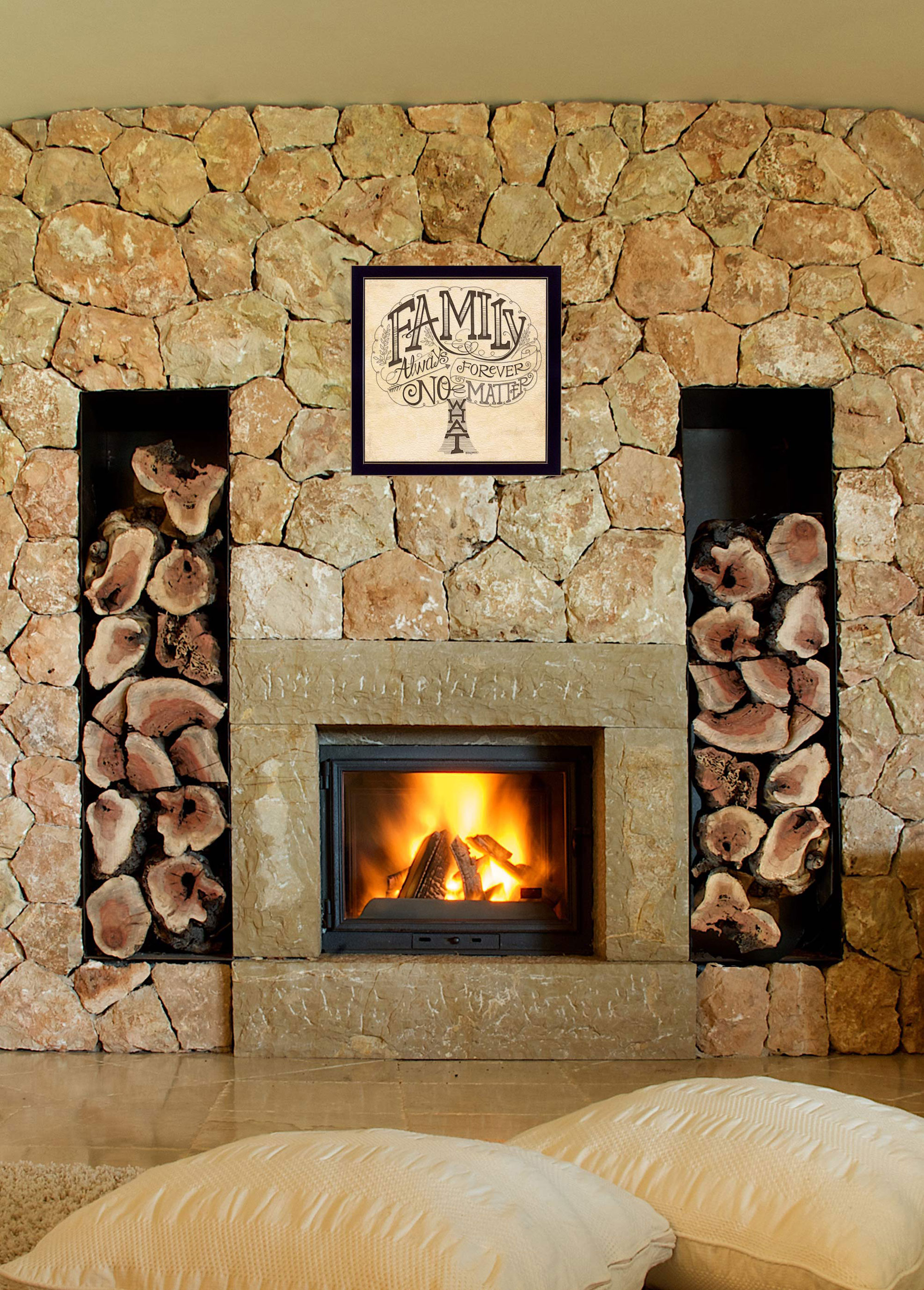 Family-Always and Forever is a 20"x20" framed print by artist Deb Strain. This artwork features a silhouette of a tree and reads family always forever no matter what. This print is textured and ready to hang.