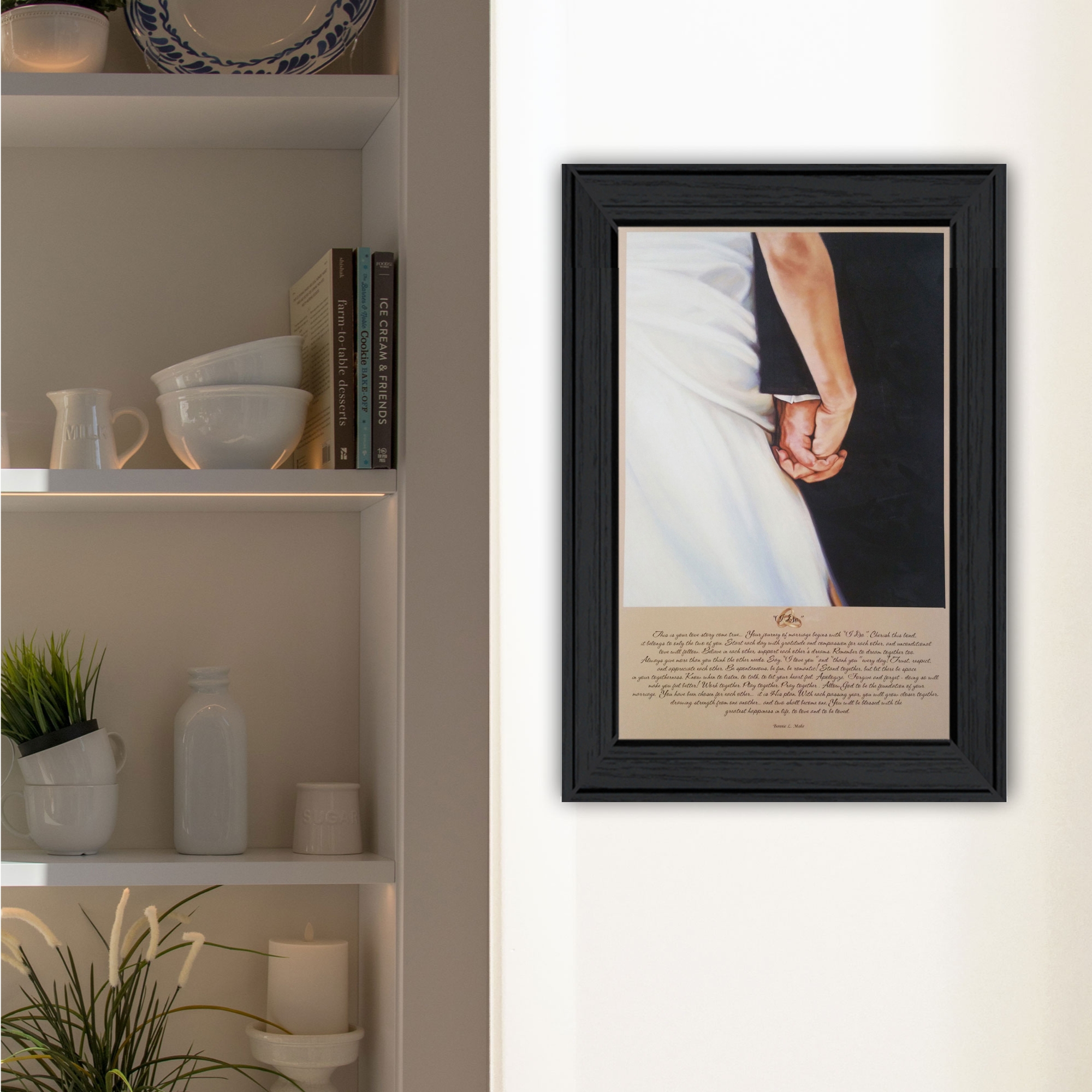 COW197-405 "I DO" is by featured artisan Bonnie Mohr. This decorative black framed wall art is measuring 15"x21". This artwork features a romantic and devotional script with a man and woman holding hands. The script says "This is your love story come true… Your journey of marriage begins with I Do. Cherish this bond it belongs to only the toe of you. Start each day with gratitude and compassion for each other, and unconditional love will follow. Believe in each other, support each other's dreams. Remember to dream together too. Always give more than you think the other needs. Say I love you and thank you every day! Trust respect and appreciate each other. Be spontaneous be fun be romantic! Stand together but let there be space in your togetherness. Know when to listen, to talk, to let your heart fell. Apologize forgive and forget doing so will make you feel better! Work together, play together. Allow god to be the foundation of your marriage. You have been chosen for each other... it is his plan. With each passing year, you will grow closer together drawing strength from one another… and tow shall come one. You will be blessed with the greatest happiness in life to love and to be loved. Our products are proudly made by skilled American workers. The surface of our framed art is textured with a fade resistant coating, so no glass is necessary. A vegetable-based glue is used in the production of our products, and our frames are crafted from 100% recycled material. In keeping with our environmentally friendly approach toward manufacturing.