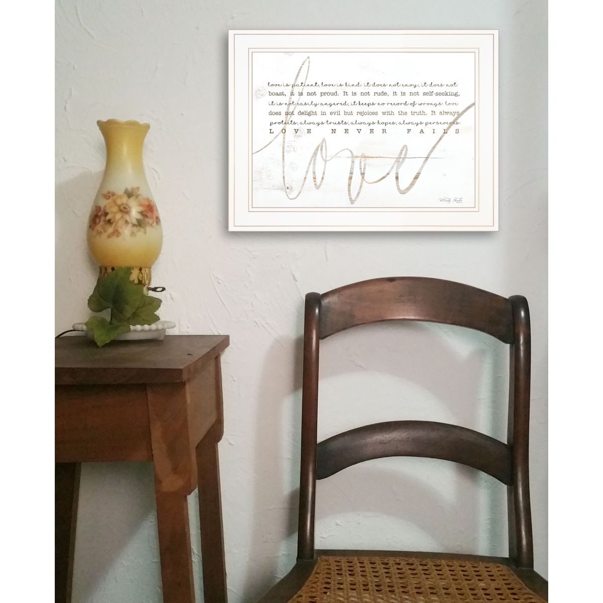 "Love Never Fails" is by Artisan Cindy Jacobs. This 19"X15" decorative white framed wall art features typography sign that display a love quote. Our products are proudly made by skilled American workers. The surface of our framed art is textured with a fade resistant coating, so no glass is necessary. A vegetable-based glue is used in the production of our products, and our frames are crafted from 100% recycled material. In keeping with our environmentally friendly approach towards manufacturing. Arrives ready to hang
