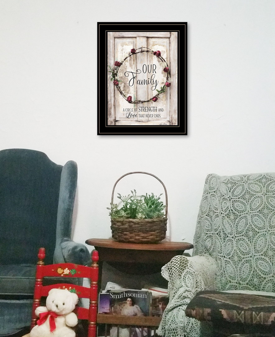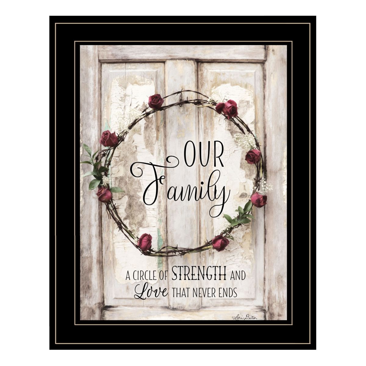 "Our Family" is by Artisan Lori Deiter. This 15"X19" decorative black framed wall art. Simple but elegant this print features a wooden door with peeled paint door, a barb wire fence hang on a hook making a wreath with roses and baby's breath. The script in the middle of the wreath reads "Our Family" and under the wreath the script reads "A circle of strength and love that never ends". Our products are proudly made by skilled American workers. The surface of our framed art is textured with a fade resistant coating, so no glass is necessary. A vegetable-based glue is used in the production of our products, and our frames are crafted from 100% recycled material. In keeping with our environmentally friendly approach towards manufacturing. Arrives ready to hang.