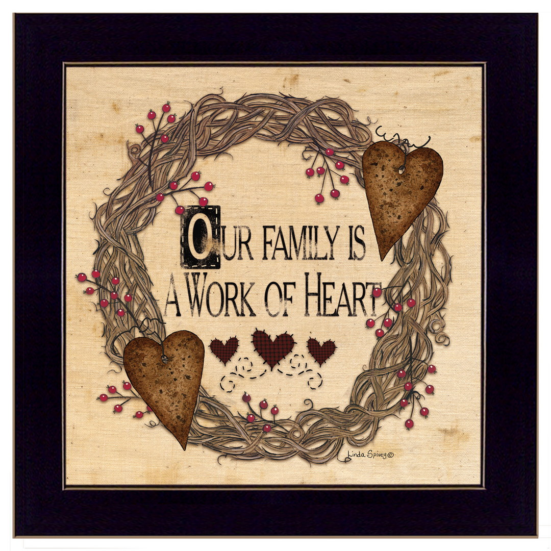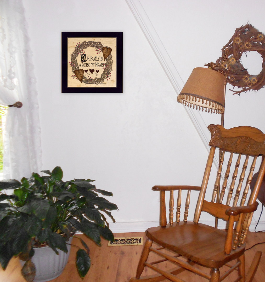 Our Family is a work of the Heart Linda Spivey. This decorative black framed print 14"x14" of a primitive wreath with a star and berries and saying "Our Family is a work of the Heart". Framed print has a UV coating (glass is not needed)arrives ready to hang.