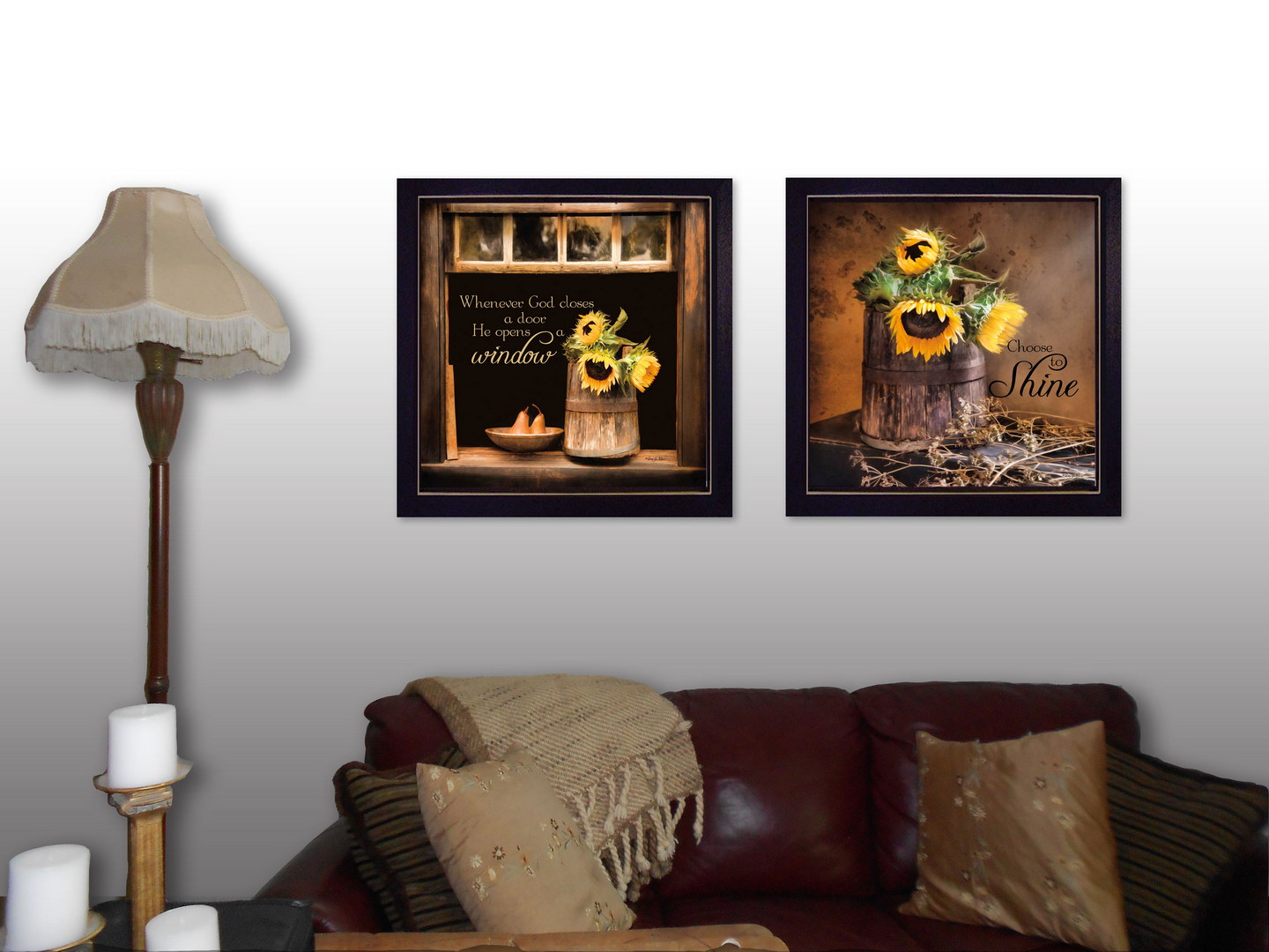 V364-712 Sunny Windows, by artist Robin Lee Vieira, a decorative 2 piece grouping in matching 14 x 14 black frames. This set has the script "Whenever God closes a Door, He Opens a Window" and "Choose to Shine" both with a primitive background accented with sunflowers. The surface of the prints is textured with a fade resistant coating so no glass is necessary. Arrives ready to hang. Made in the USA by skilled American workers.